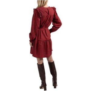 Plaid Pattern, Adjustable Waist Tie Belt, 2 Side Pockets, Keyhole Back With Button Closure, Ruffle Shoulders, Ruffle Cuffs, Smocked Yoke, Long Sleeve, Crew Neck, Drop Waist. Perfect for the holiday season!