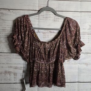 NWT LIFE Love Is For Eternity Womens Crop Top size large, Puff Sleeves Split Front Peasant top brown and pink.