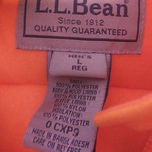 NWT LL Bean Hunter Orange hooded coat size Large FLAWED . Flaws last 3 pics show dust I did my best photograph the flaws . The last pic was a stain I suspect from the wheel of a shopping carriage I did try to spot clean that one spot, it is lighter then it was but still you can see the stain . Flat lay measurements : armpit to armpit ~ 26". From top of shoulder to bottom hem ~ 30.5". From top of neck to cuff ~ 32.5" Please see above photos for what was measured. Questions are always welcome . 100% polyester , sleeve lining nylon . Zipper closure with snaps , snaps on sleeves . This material feels reminds me of those microfiber magic cloths which is probably why it so readily picked up dust in the back of his closet. Heavy coat probably very warm . I thought this would fit him but he likes longer arms so an XL is what he wears. I have placed it in a clear plastic bag waiting for it's new owner to try and keep the dust off this time. 2 front pockets , There is an extra button