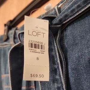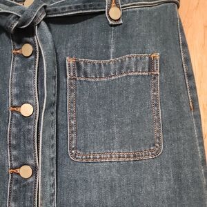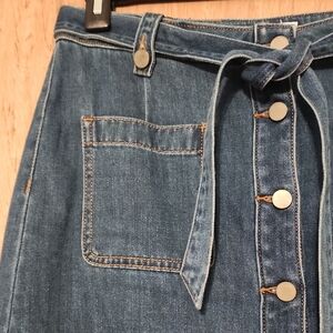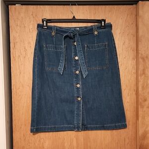This knee-length jean skirt from LOFT features a stylish tie front. The classic blue color and sleek design make it a versatile addition to any wardrobe. This has buttons down the front to get on and off and a little bit of a slit at the bottom where the buttons don't reach. It has 2 pockets in the front and back. Its new with tags and a size 8.