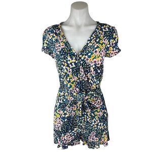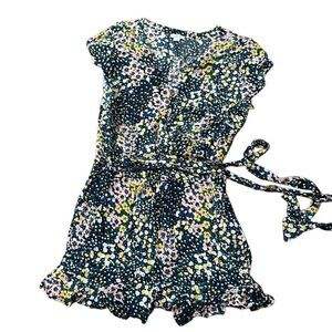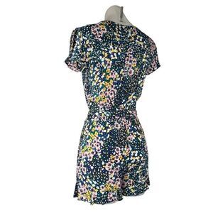 New with Tags! Ann Taylor LOFT’s Floral Wrap One Piece Romper in women’s size Large. Beautiful pink, teal, yellow print. Tulip cap sleeves and Ruffled hem. Hidden buttons at bust for a comfortable fit. Elastic waist with matching tie for a flattering, flowy look. Add this fun, floral piece to your wardrobe.