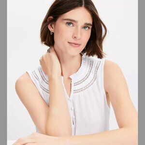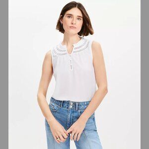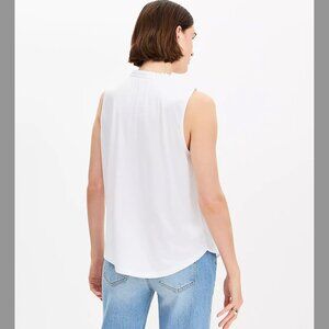 Starring a ruffle neck, flirty cutouts and a soft knit back, we swoon for freshed-up, prettied-up staples like this fluid woven shell. Button placket. Sleeveless.