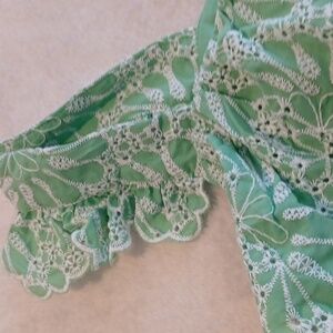 Elegant mint blouse with floral lace and ruffled neckline. Ideal for a fresh, stylish look.