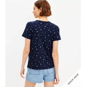 NEW WITH TAGS - RETAIL $35 - SIZE MEDIUM - This LOFT Navy W/Fireworks Print Everyday Crew Tee is precious! Our go-to, day after day: in 100% cotton slub, they’re easy, breathable and softer with every wash. (Oh, and you asked, we acted: we increased the weight just slightly to make them less sheer.) Crew neck. Short sleeves. Side slits. • Fit: Classic — follows your contours with a little room • Fabric: Soft knit • Length: Regular – hits below natural waist • 25 1/2" long Available in: Blue FABRIC & CARE • 100% Cotton • Machine Washable
