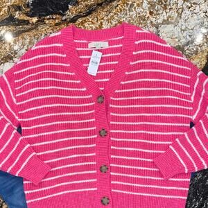 NWT LOFT Neon Pink and White Striped Relaxed V-Neck Cardigan