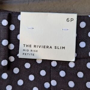 New with waistband tag black and white polka dot The Riviera Slim Mid Rise Pant from LOFT. Zipper fly and double hook closure with security button. Belt loops. Front and back pockets. 97% cotton 3% spandex. 24.5" inseam. Machine washable. Clean. No flaws.
