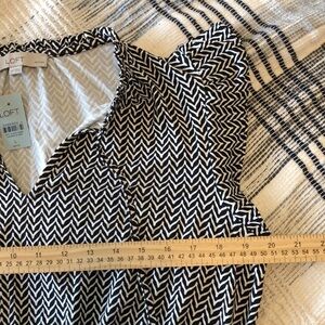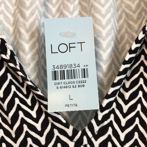 This is a new with tags LOFT Womens dress in a size large petite. It is a black and white herringbone print. It has a smocked waist and flutter sleeves. It has a tie at the neck.