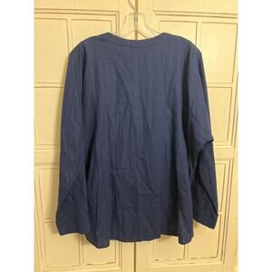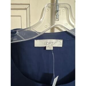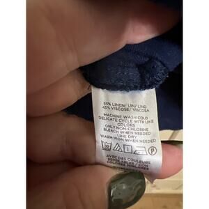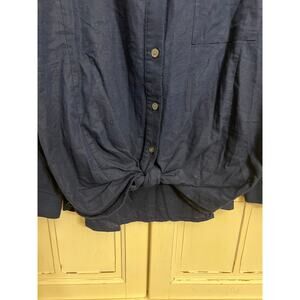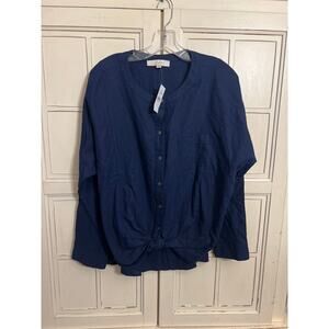 New with tags LOFT size large navy blue linen blend top. Buttons down the front and ties at the waist. Measures 24” from armpit to armpit and 25” long.