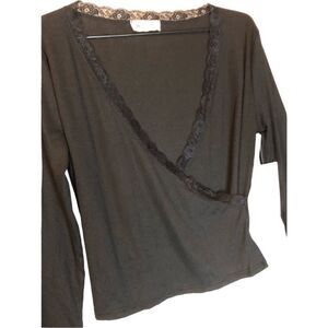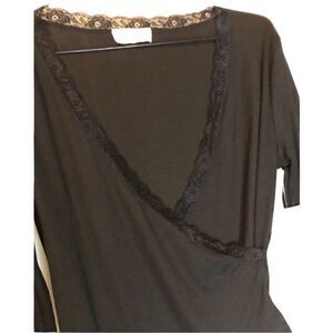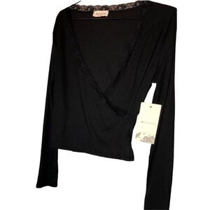 NWT LOVE WINS Women’s Black Top Blouse Open V-Neck Lace Detail Long Sleeves