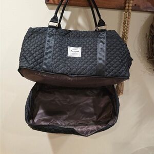 Stylish black quilted travel bag set. Includes a large bag and a small pouch. Perfect for travel.
