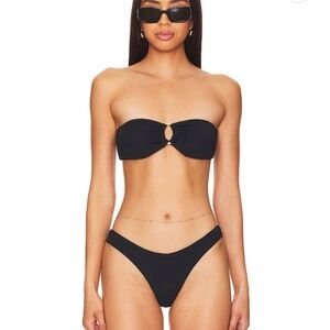 NWT Black Bikini Top, Strapless/Bandeau style. Ribbed material. L-Space brand. Removable padded cups. Back tie closure. Front gold-tone accent.