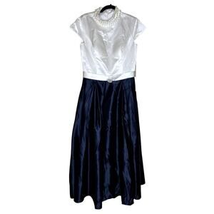 NWT LT LanTing Bride Dress Gown Dark Navy Blue Pearl White Women's Size 10 Faux Pearl and Faux Diamond gems detail short sleeve accent attached belt Mock Neck Back Zip Closure