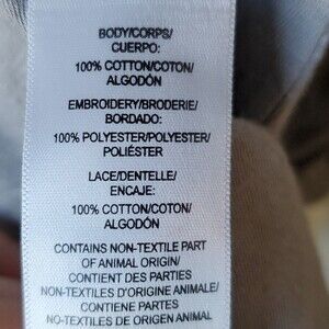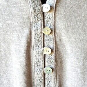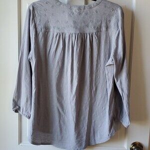 New 3-button cotton peasant shirt. Neutral gray. Embroidered details at neckline, shoulders and back yoke. Cotton. Gathered shoulders and back and 3/4 sleeves. Super comfy. Fancy tee shirt.