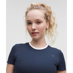 This is a new with tags Lululemon Court Crush X Tee. The shirt is a dark blue color with white trim around the neck. The shirt is a cropped style with short sleeves. The shirt is made of 82% Nylon and 18% Elastane. The shirt has a small Lululemon logo on the front. The shirt has a built-in shelf bra for light support.