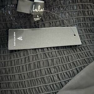 Size large. Short puff sleeves. Side hidden zipper. Back smocking. Sweetheart neckline. Polyester, spandex.