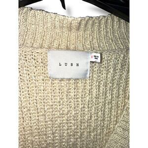 Soft, cozy, and easy to style — this LUSH colorblock cardigan is perfect for fall layering or chilly evenings. Features a gorgeous, creamy pink and beige palette with tonal stripes and a fluffy textured knit along the sleeves and body. Finished with a ribbed trim, drop shoulders, and a button front. Made from an acrylic blend. New with tags, size Small. Get your Fall wardrobe started today with this adorable piece!