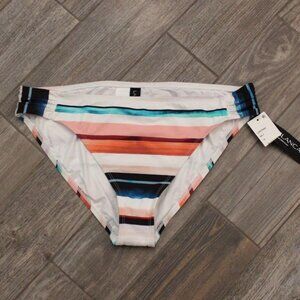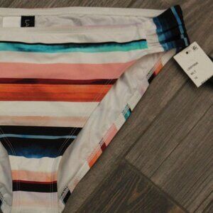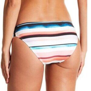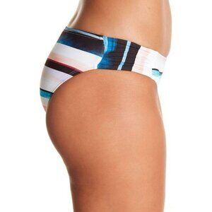 Shirred sides add a cutesy touch to this colorblock striped hipster bikini bottom.