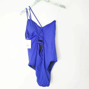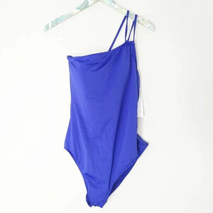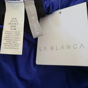 New with Tags La Blanca Island Goddess one shoulder one piece swimsuit in blue. Crisscrossed strappy back ties at back. Tummy tamer technology. Removable cups.