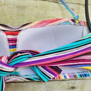 Gorgeous, colorful Bikini. This bandeau top bikini features a removable halter strap, padded cups (not removable). a tie back and enforced sides. The bikini bottom is lined - it does not have the sanitary liner - it wasn't there when this was purchased. It's made of 85% Polyester, 15% Elastine. The top measures 42.5 inches from the back tie end to end. The bikini bottom measures 30 inches at the opening. If you have any questions, please ask.