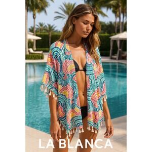 Colorful beach coverup with white tassel trim. New with tags attached. Goes with any color. From a smoke free home.