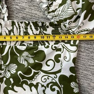 Square neckline and elbow-length puff sleeves with ruffle trim