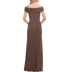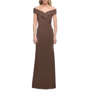 NWT La Femme 27959 Off Shoulder Draped Ruched Full Length Gown in Cocoa Sz. 10