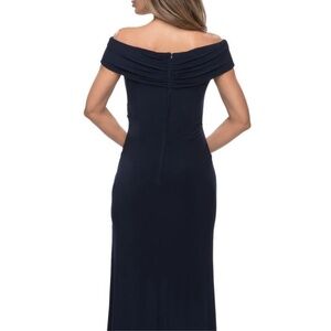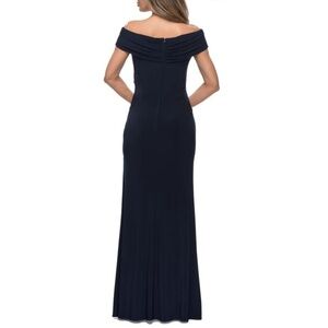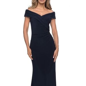 NWT La Femme 27959 Off Shoulder Pleated Ruched Jersey Gown in Navy Sz. 6
