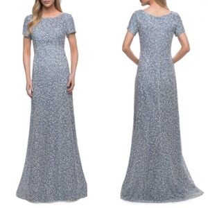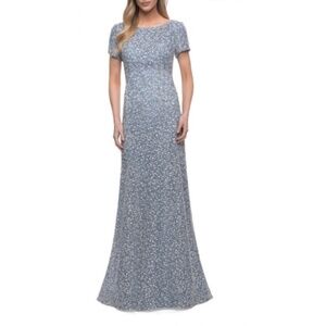 NWT La Femme 29134 Embroidered Embellished Short Sleeve Gown in Steel Blue Sz. 6