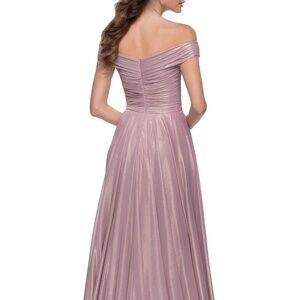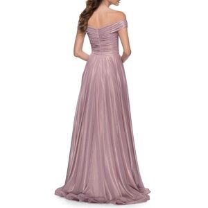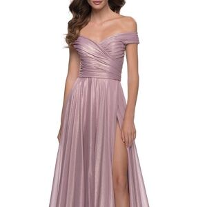 NWT La Femme 29172 Ethereal Metallic Chiffon Full Skirt Off Shoulder Gow…