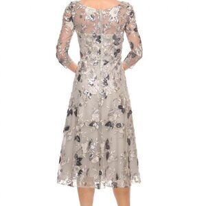 The entire look is adorned with exquisite floral appliques and sequin accents, creating a shimmering impression. The fitted bodice is accented with an illusion bateau neckline and quarter-length sleeves. The exquisitely embroidered lace covers the entire back, giving the impression that it is open and has a zipper closing. The skirt is tea length, with a flowing finish.
