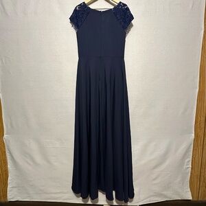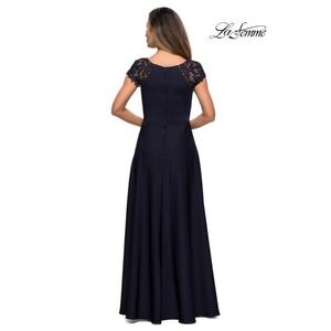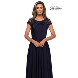 NWT La Femme Cap Sleeve Evening Gown in navy blue. This long evening gown has a pleated bodice and high neckline. Features elegant sheer lace cap sleeves and a flowy skirt. Back zipper closure. Bust pads. Perfect for mother of the bride/groom. Size 10.