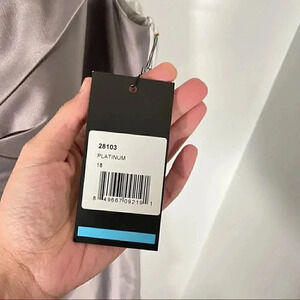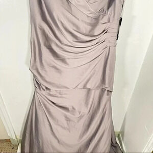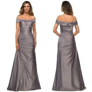 NWT La Femme Off the Shoulder Ruched Satin Trumpet Gown in Platinum