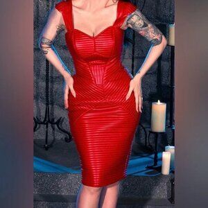 La Femme En Noir quilted blood red vegan leather Order of The Dragon two piece dress (pencil skirt and bustier top) from 2023 Bram Stoker's Dracula collection, completely sold out, NEW WITH TAG never worn