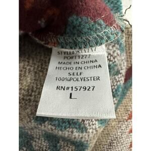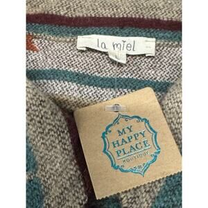The NWT La Miel Jacket in size Large features a Southwest Aztec Navajo Blanket design with a raw hem, making it a unique and stylish addition to any wardrobe. This mid-length jacket has long sleeves, a button closure, and is made from polyester fabric with a woven texture. The colorful Aztec pattern and vintage style give it a bohemian, hippie-inspired look, perfect for casual or party occasions during the fall, winter, and spring seasons. Additionally, this oversized jacket has a regular fit, pockets, and is designed with a distressed raw hem for added flair.