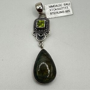 This is a stunning combination of stones in a Bali sterling silver pendant. The labradorite is about 22x14mm and it is accented by a princess cut peridot measuring about 6mm. Stamped 925 on the back of the pendant. The whole pendant measures to be a little over 2" long (from the top of the bale to the bottom).