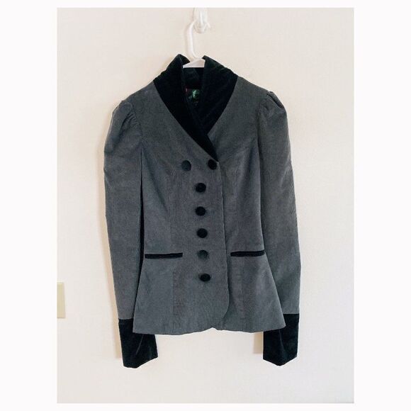 Rare designer piece from a line by Gregor Clemens for an European carbon neutral brand Lac Et Mel. Dark green corduroy jacket with a button down front. Black velvet cuffs, lapels and buttons. Faux pockets in the front. Lined in pink fabric. An elegant and timeless design, great for spring and transitional weather.