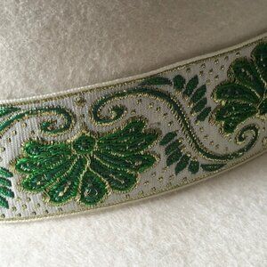 100% Australian wool. Felt fabric with satin lining. Embroidered band with metallic gold threading. Brim measures approx 3" in length.