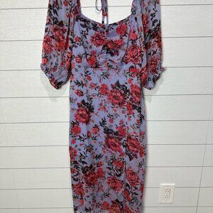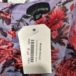 NWT Lucy Paris Lavender Floral Dress Size Medium. Stunning! Bottom slit, lined to around the knee, sheer bottom and sleeves. Rouched at bust, zipper entry in back. Can be worn on or off shoulders with elastic and tie. Pit to pit is approximately 17” and length is approximately 45” from shoulder to hem.