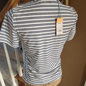 NWT Ladies Black and white Striped short sleeve swimwear top. made of swimwear material. Says XS (0-2) but fits closer to a medium (4-6).