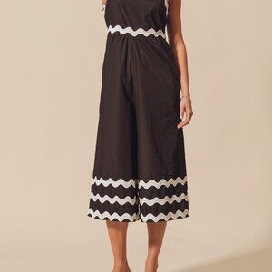 Black wide leg jumpsuit with white scalloped ric rac trim