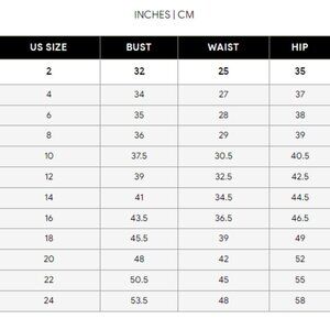 Sizing tips: Every designer cuts their dresses differently & according to their size chart. Please measure yourself (in inches) before ordering & follow our size chart (pictured under the main dress picture). If you are in between sizes or unsure of the fit, choose a size up, as it is easier for your seamstress to take in rather than out. Please refer to the size chart in our images section.