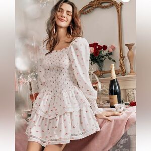 NWT Lait Collection Dora Valentine puff sleeve off shoulder mini dress hearts love lace Galentine’s medium m