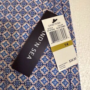 The product is a pair of Land N Sea blue and orange geometric print flat front shorts for women in size 14. These chino style shorts feature a unique geometric pattern in blue, making them a stylish addition to any wardrobe. The flat front design adds a modern touch to the classic shorts, perfect for a casual day out or a fun summer adventure.