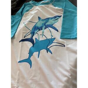 NWT Lands’ End Short Sleeve Rash Guard Swim Crew Neck White Shark Blue Big Boy
