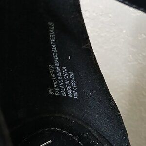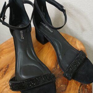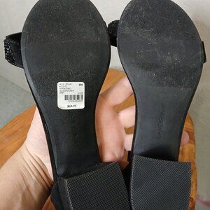 This dressy black shoe has an ankle strap and black faux gems across the open toe design. Perfect for holiday parties or formal events.