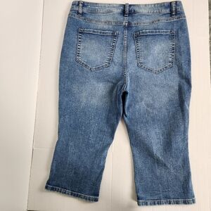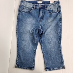 These Lane Bryant High-Rise Signature Fit Blue Pedal Jeans are a size 16 with a classic fit. They feature belt loops, zipper and button closure, five pockets, side slits at the hem with a cropped style, a 12-inch rise, and a 19-inch inseam, perfect for all season long.