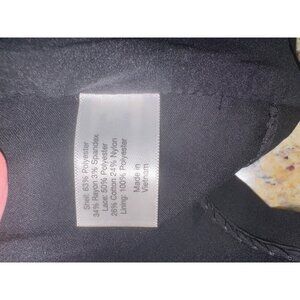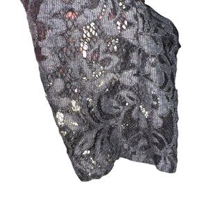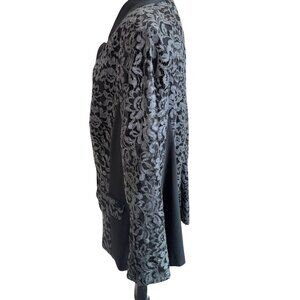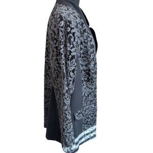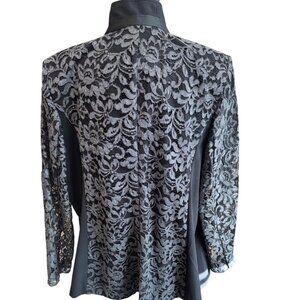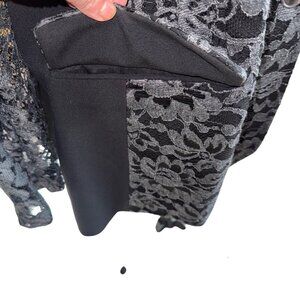 A stylish black blazer featuring an elegant lace overlay. Designed for a chic look, it offers a flattering fit and a sophisticated touch. Retails for $99