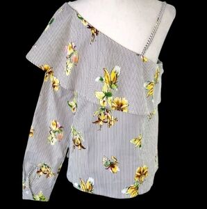 Elevate your style with this chic floral striped one-shoulder top. Featuring a blend of black and white stripes with vibrant yellow floral accents, this top is perfect for any occasion.