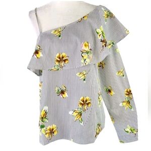 Elevate your style with this chic floral striped one-shoulder top. Featuring a blend of black and white stripes with vibrant yellow floral accents, this top is perfect for any occasion.