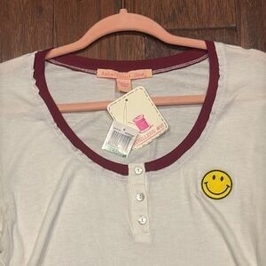 Chic Henley shirt in white with burgundy trim. Features a playful smiley patch.